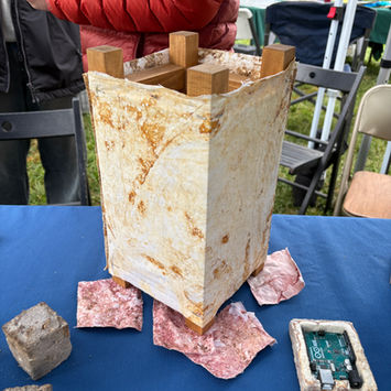 Visitors got to hold and tap on our Mykobricks to see how strong and lightweight they are. They asked students about growing mycelium leather (featured in a lamp made by the Design team) and dyeing it with mushrooms (samples by the Color team). We explained our sealant experiments and our attempts to mix mycelium with adobe. We also displayed a mycelium circuit board and fashion accessory, made by former Design MFA student Eldy Lazaro.